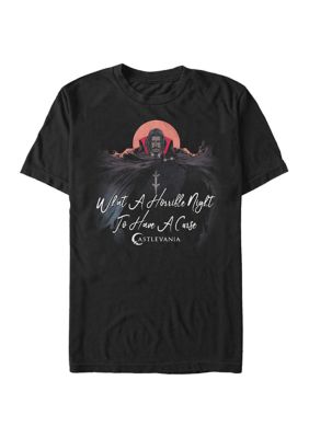 Dress in a style befitting a Count with an officially licensed Castlevania style! Celebrate your favorite anime-inspired Netflix series with a cool tee that shows off the vampire hunter Trevor Belmont, the magician Sypha Belnades, or Dracula's son Alucard! | Men's Castlevania Horrible Night To Have A Curse T-Shirt