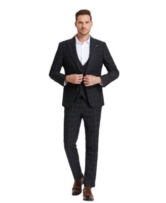 Dark Grey Windowpane Mens-suit | Tazzio Mens 3 Pc Suit Windowpane With Matching Vest & Pants, Grey, 50